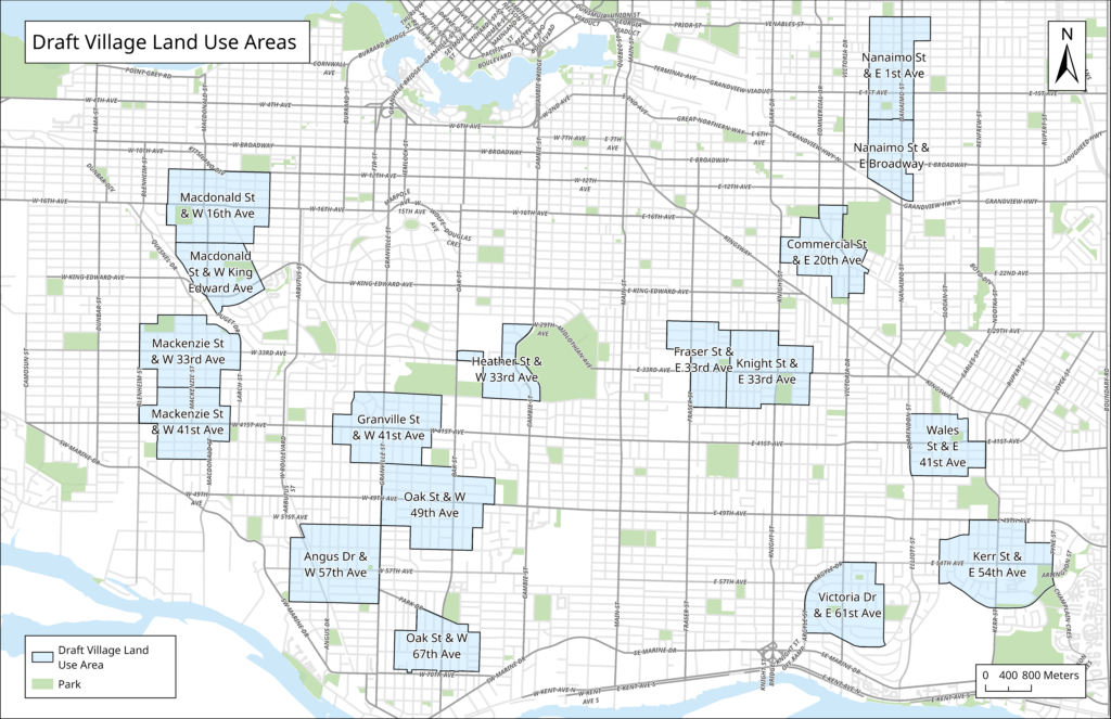The Villages Planning Program identifies 25 neighbourhood “Villages” across Vancouver. These areas will function as local hubs where residents can live, shop, and access essential services within a short walk, bike ride, or roll.